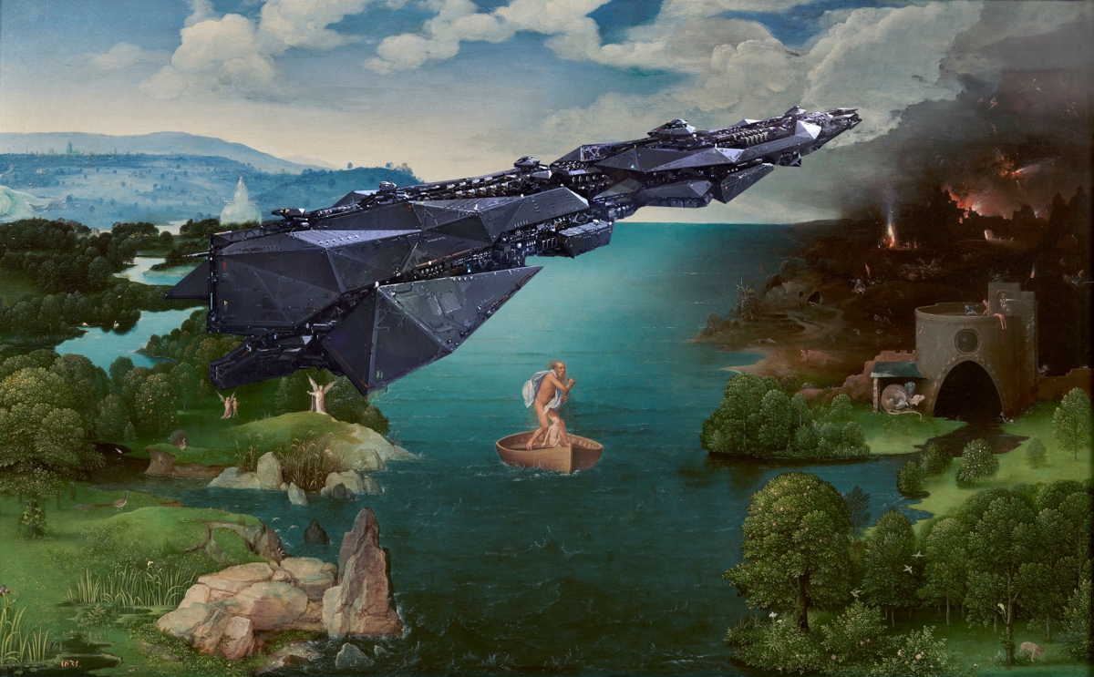 Josèfa Ntjam: Last night I started watching the film Zombi Child by Bertrand Bonello. I love the way it’s shot, but it should really be seen in a cinema and not on a computer! I also saw Atlantique by Mati Diop: the zombies come to say goodbye to the people they loved more than to seek vengeance. They are ‘wandering souls’ since their death did not take place correctly. I’ve often used in my work the concept of ‘boatlessness’, which comes from ancient Egypt, whereby you are doomed to immobility. The fact that you don’t have a boat prevents you from crossing the Styx in the proper manner, and so you are doomed to wander above the river of death and haunt others. Within the ‘boatless’ arborescence that I constituted, I hung Sun Ra’s Spaceship, which picks up wandering souls to take them to another planet in order to experience their death fully. An image of one of my videos could echo that. We can see the encounter between the sixteenth-century painting Landscape with Charon Crossing the Styx by Joachim Patinir and a futurist spaceship. It’s an extract from my project Liqueurs de sable [Liqueurs of Sand], a reading performed about a journey over water and its migratory pathways.