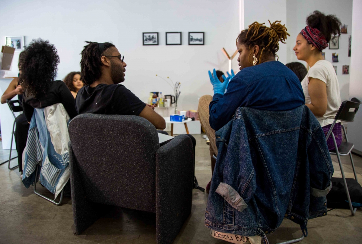 PBKL: I didn’t want to take a pedagogical approach anymore and I was tired because wherever I go, things repeat. I keep saying to people “racism is not my passion!” [laughs]. I was asked to present a workshop on feminism before a general assembly of La Centrale. I immediately thought of Claire Obscure, an afrofeminist artist and member of the Mwasi Collective,26 who had also recently arrived in Montreal. I thought it would be a good idea to perform what it is to be a black activist… This pedagogical and emotional labour that is invisible, you can make it visible through performance.