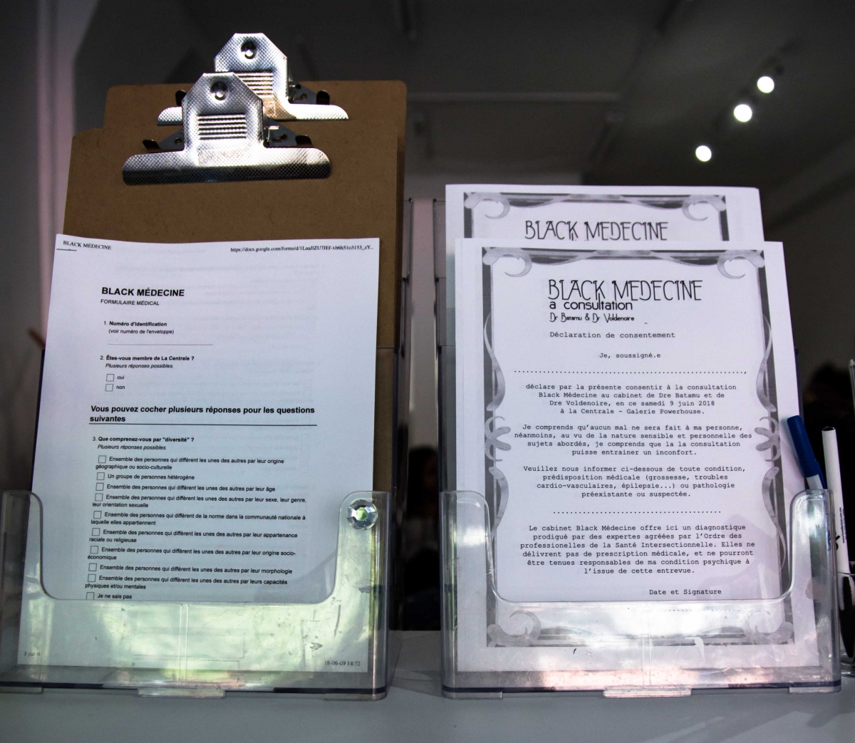 MB: You presented at La Centrale in June 2018, along with Claire Obscure,24 also an artist and activist, the project BLACK MÉDECINE: a consultation,25 a participatory performance and installation. In the roles of doctors Batamu and Voldenoire, you analyse questionnaires and discussions with white patients in order to make a diagnosis regarding their ordinary racist behaviour. What does this performance produce that non-artistic actions couldn’t achieve? How do you combine art and activism?