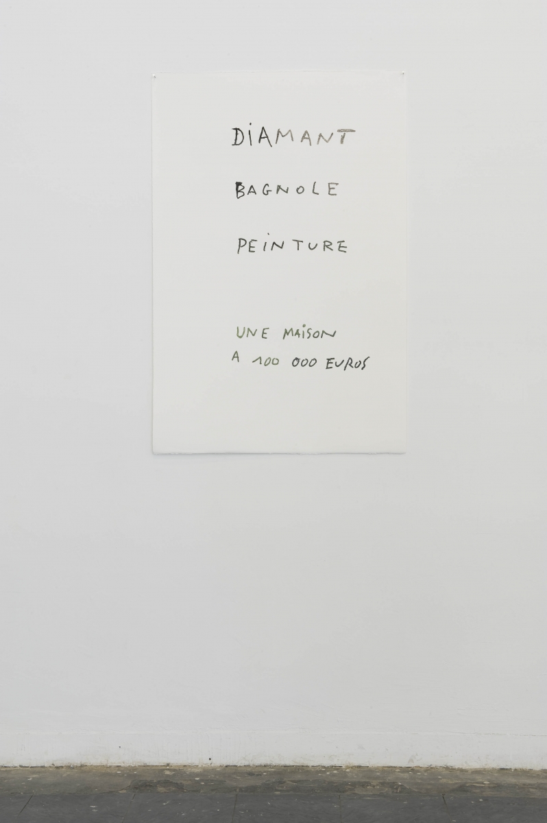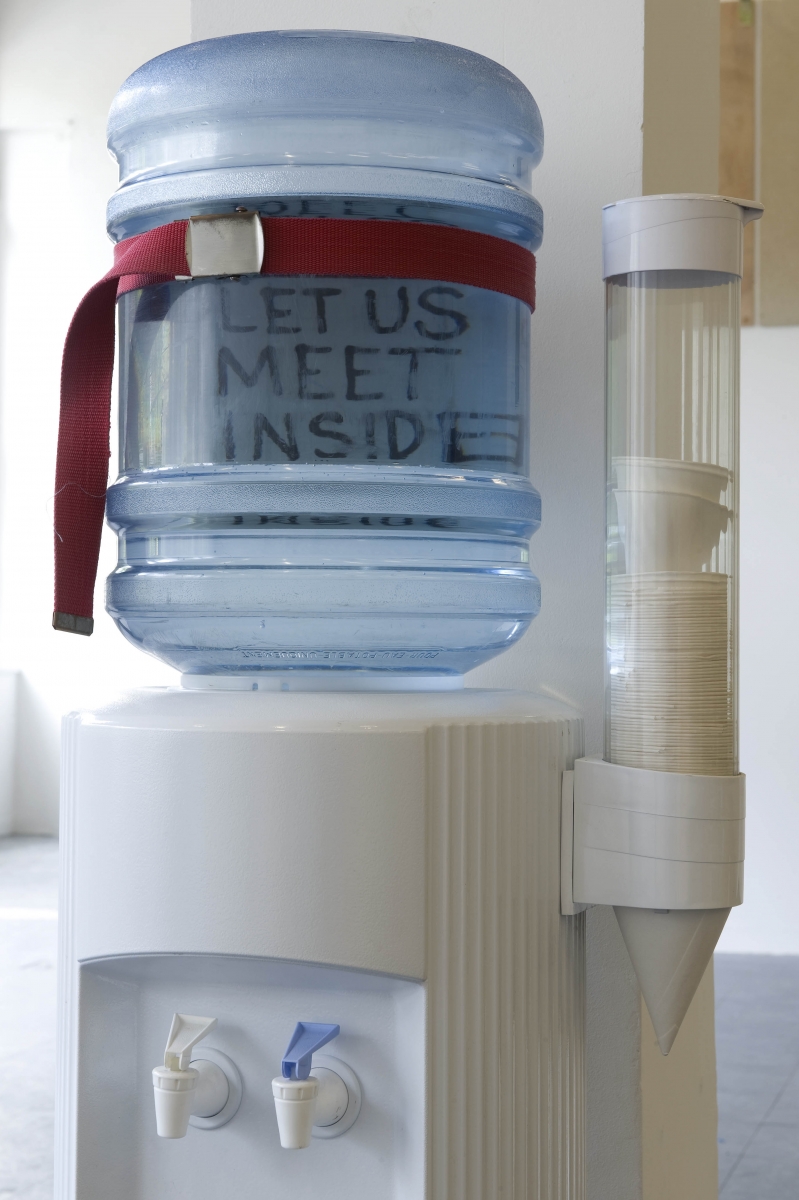 Les œuvres de l’exposition ont finalement de commun qu’elles empruntent au réel des objets et des mots, dont les assemblages minimalistes révèlent un pouvoir de suggestion certain. La phrase «Let us meet inside you» (2010) inscrite par Navid Nuur, apparaissant par transparence à l’arrière de la bonbonne d’un distributeur d’eau, n’est pas sans ambiguïté. Est-il question de la rencontre de l’œuvre avec le spectateur ? De l’invitation faite au visiteur de prendre part active à l’œuvre en se servant un verre d’eau ? Plus directement, les quelques mots tracés dans la Liste non-exhaustive (2009) de Thomas Bernardet - diamant, bagnole, peinture, une maison à 100 000 euros - évoquent un monde de luxe et de richesse, inversement proportionnel à la simplicité de l’énoncé de l’artiste. Dans un coin, l’installation discrète de David Beattie (Remote Past-Future, 2009), un morceau de contreplaqué en appui contre le mur cachant une diode rouge se réfléchissant sur un bout de papier aluminium froissé, élabore en trois touches un petit paysage énigmatique. C’est avec davantage de mystère encore que Marc Geneix élabore l’œuvre Finite Space (2010), une feuille de papier recouverte de graphite et froissée, évoquant toute la potentialité contenue dans une feuille vierge parcourue par un crayon à papier. Un champ des possibles où réside cette suspension même du sens et des choses.