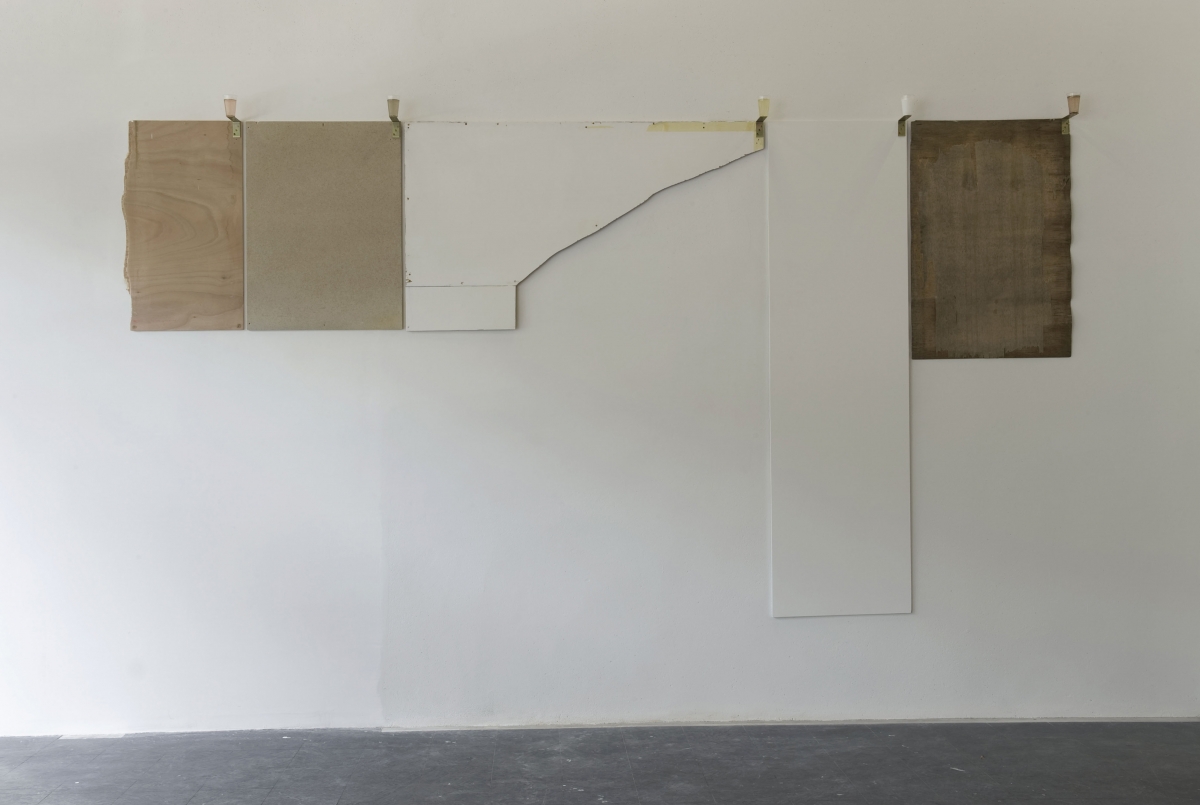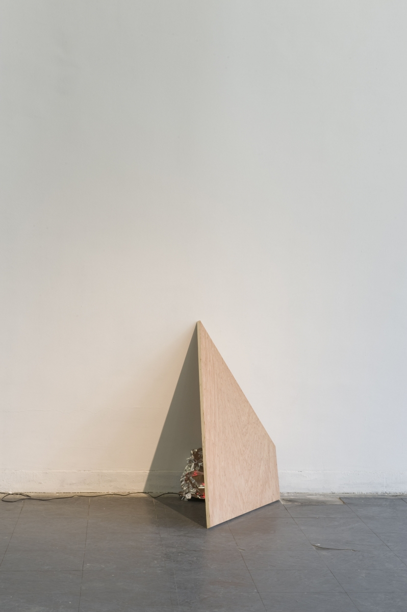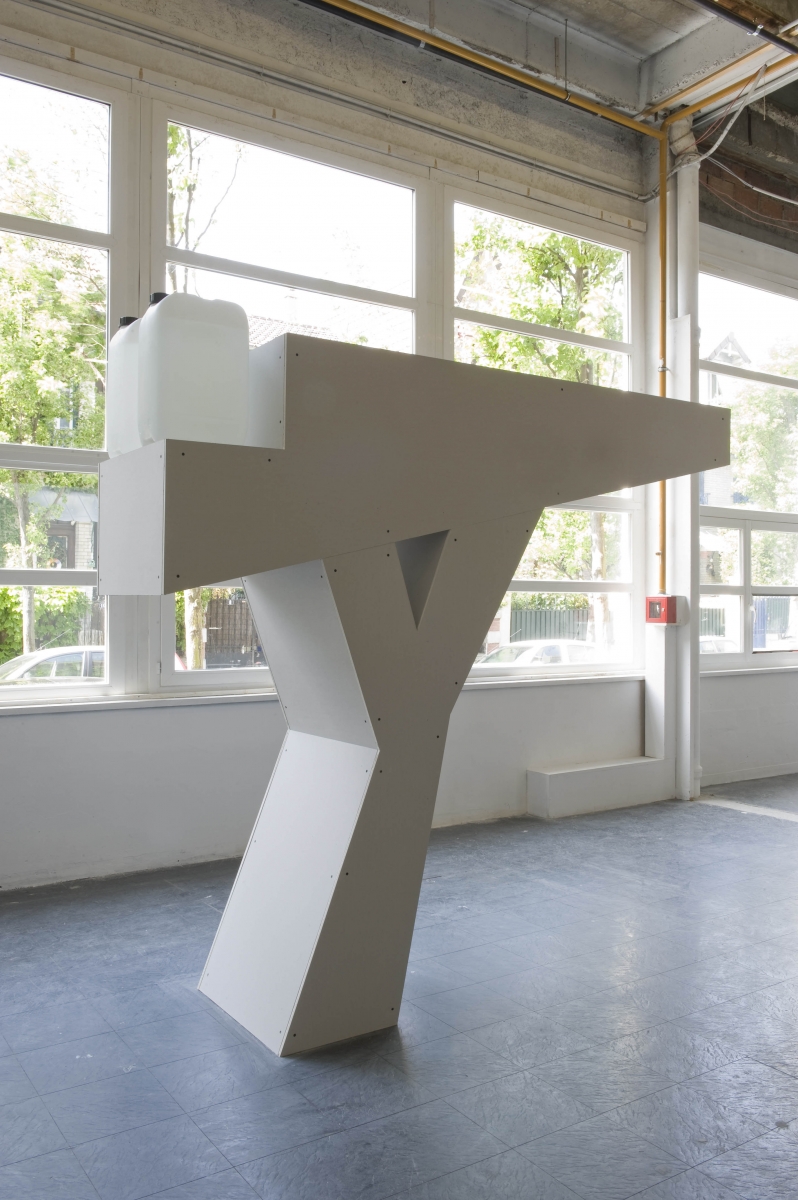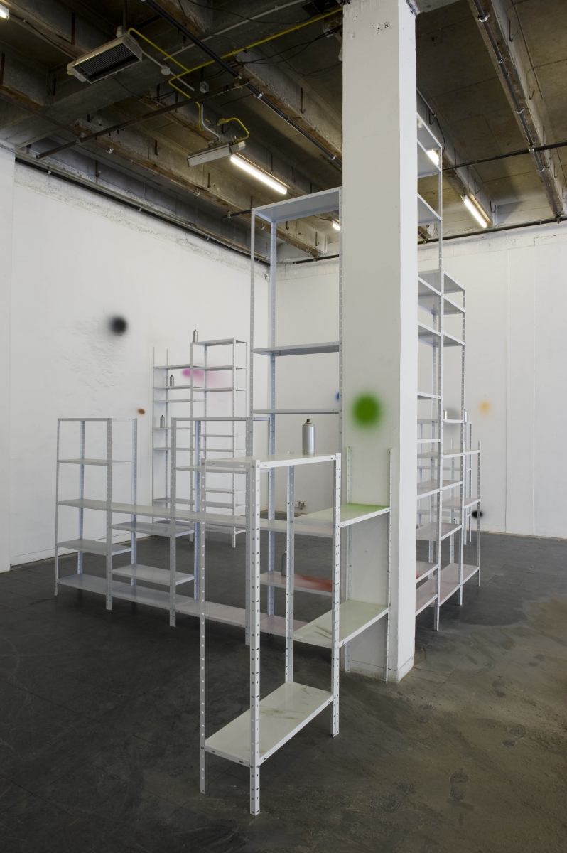 À première vue, plane la sensation d’être arrivé trop tard et de ne saisir que les traces de l’intervention des artistes, celle notamment de Gerken qui a actionné des bombes de peintures de plusieurs couleurs en différents points de sa structure métallique en direction des murs, formant des taches de peinture plus ou moins régulières. Mais c’est moins le résultat qu’un entre-deux qui est donné à voir, comme la nature morte saisit le périssable à un instant donné. L’inertie de l’exposition sous-tend une tension latente de l’objet qui a été activé ou près à l’être. Soumises à ce rapport au temps particulier, certaines des pièces œuvrent dans l’attente et la suspension. La forme minimale en équerre de la sculpture de Matt Calderwood est lestée de deux bidons d’eau qui la retiennent de s’effondrer vers l’avant. L’installation de Sébastien Maloberti (Sans Titre, 2010), faite de plaques de contreplaqués de récupération, répond formellement à ce jeu d’équilibre où, tel un caméléon, chaque morceau de bois s’assortit à l’eau contenue dans le gobelet qui y est fixé de manière instable.