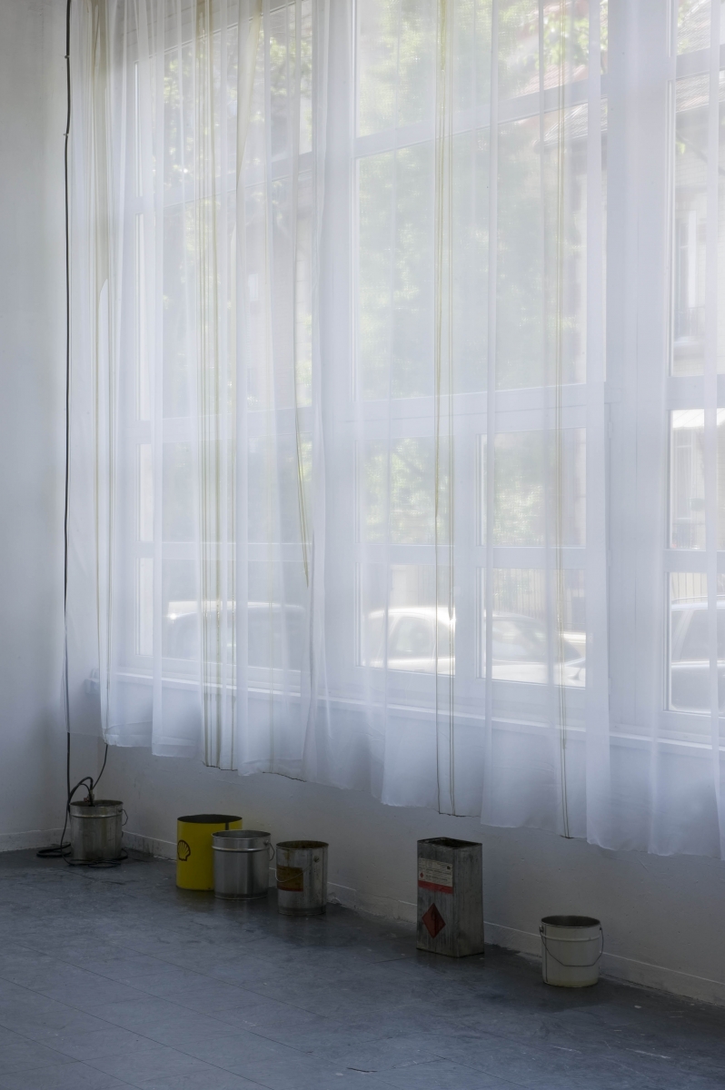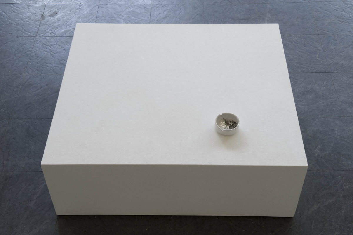 D’autres œuvres fonctionnent sur un temps cyclique et perpétuel. Le rideau de Delphine Reist obstrue l’une des fenêtres. Le long du tissu, s’écoulent régulièrement des filées d’essence, récupérés par des bidons pour s’écouler à nouveau en circuit fermé. Sur un socle, repose un cendrier blanc. Au milieu des cendres, scintille indéfiniment une minuscule braise rouge, farce visuelle, intitulée avec cynisme Forever Young (2005) par l’artiste Ariel Schlesinger.