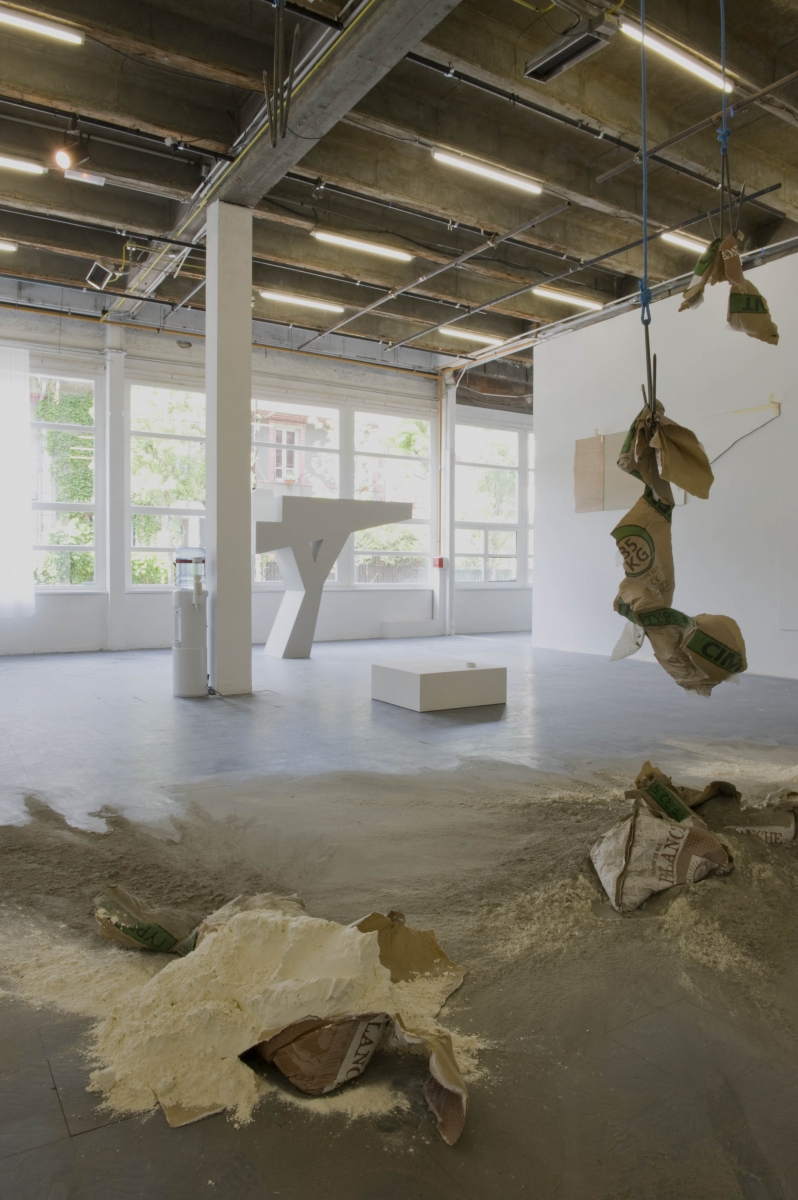 Mains d’œuvres accueillait à Saint-Ouen au printemps dernier la troisième étape du cycle d’expositions «La Part des Choses», orchestré par l’association clermontoise In Extenso, autour du travail d’une quinzaine d’artistes internationaux. «Still Life» (nature morte), titre de l’étape audonienne, projette d’emblée le visiteur dans une ambiance industrielle. Une structure en placoplâtre de Matt Calderwood (Unfinished Structure, 2007) se dresse à l’entrée, tandis que les sacs de ciments et de farine éventrés de Hervé Bréhier (Farine/Ciment, 2008) entravent l’espace sur toute la longueur, les étagères métalliques de Ingo Gerken (Les Éléments d’air, 2008) se déploient suivant un cheminement tortueux et l’odeur d’essence de l’installation de Delphine Reist (Rideau !, 2006) flotte dans l’air.