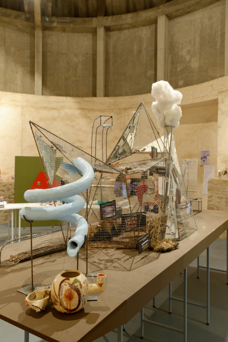 L’exposition se poursuit dans une seconde salle avec Visitor Center qui date de 2014 et prolonge le mythe familial instigué par l’artiste avec Wantee. Au centre de la pièce, se trouve la maquette d’un projet de musée dédié aux œuvres de son grand-père. Sorte de paquebot aux formes futuristes fabriqué à partir de matériaux de récupération type fil de fer, terre, bois et même d’un renard empaillé, le tout accompagné d’images explicatives, agit comme un clin d’œil drolatique aux architectures muséales de plus en plus alambiquées. L’artiste explique, par la présence de textes, l’importance de ce musée pour sa grand-mère et ses petits-enfants qui souhaitent rendre hommage à ce grand-père toujours porté disparu.