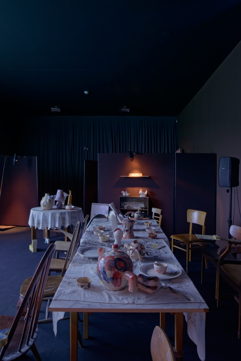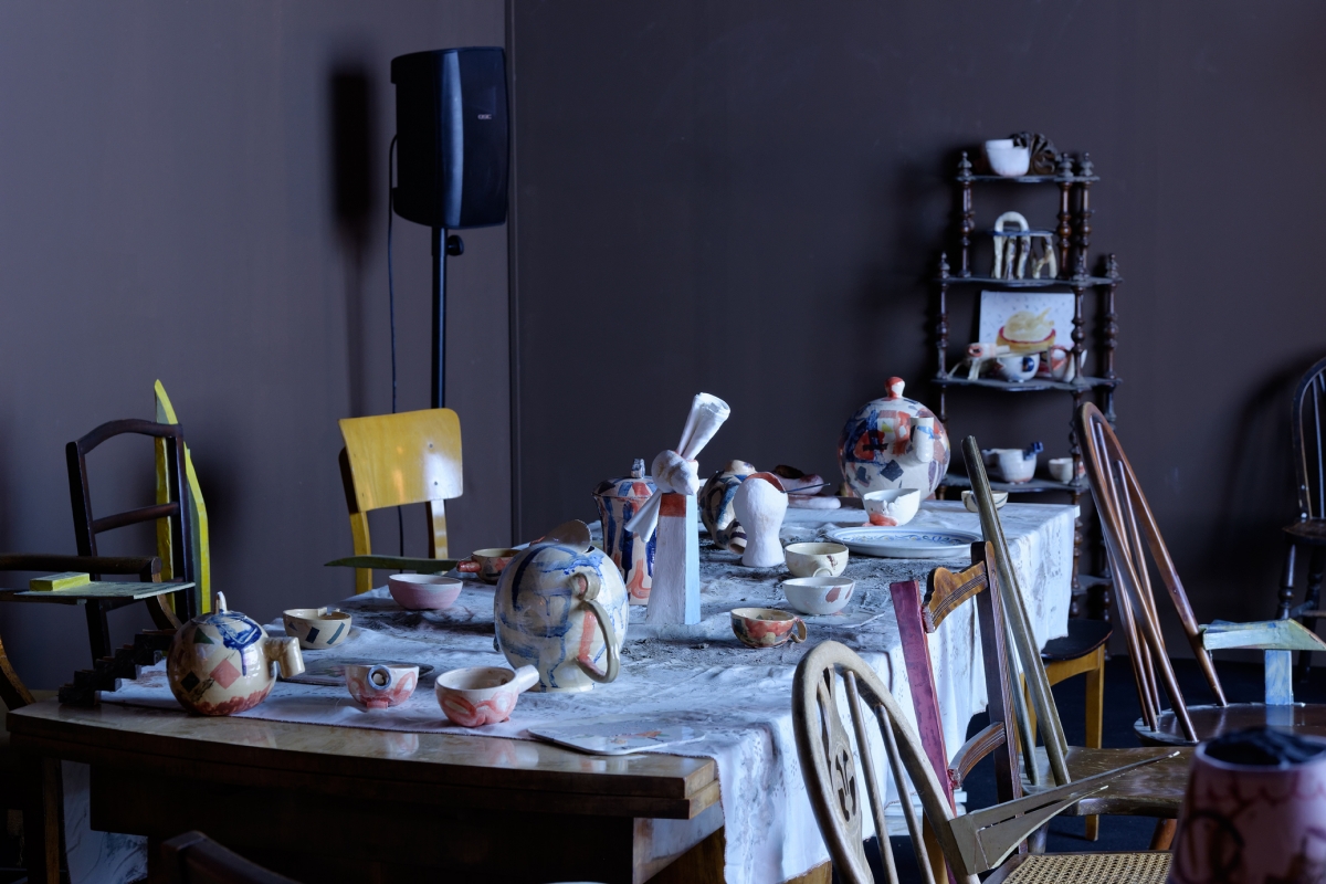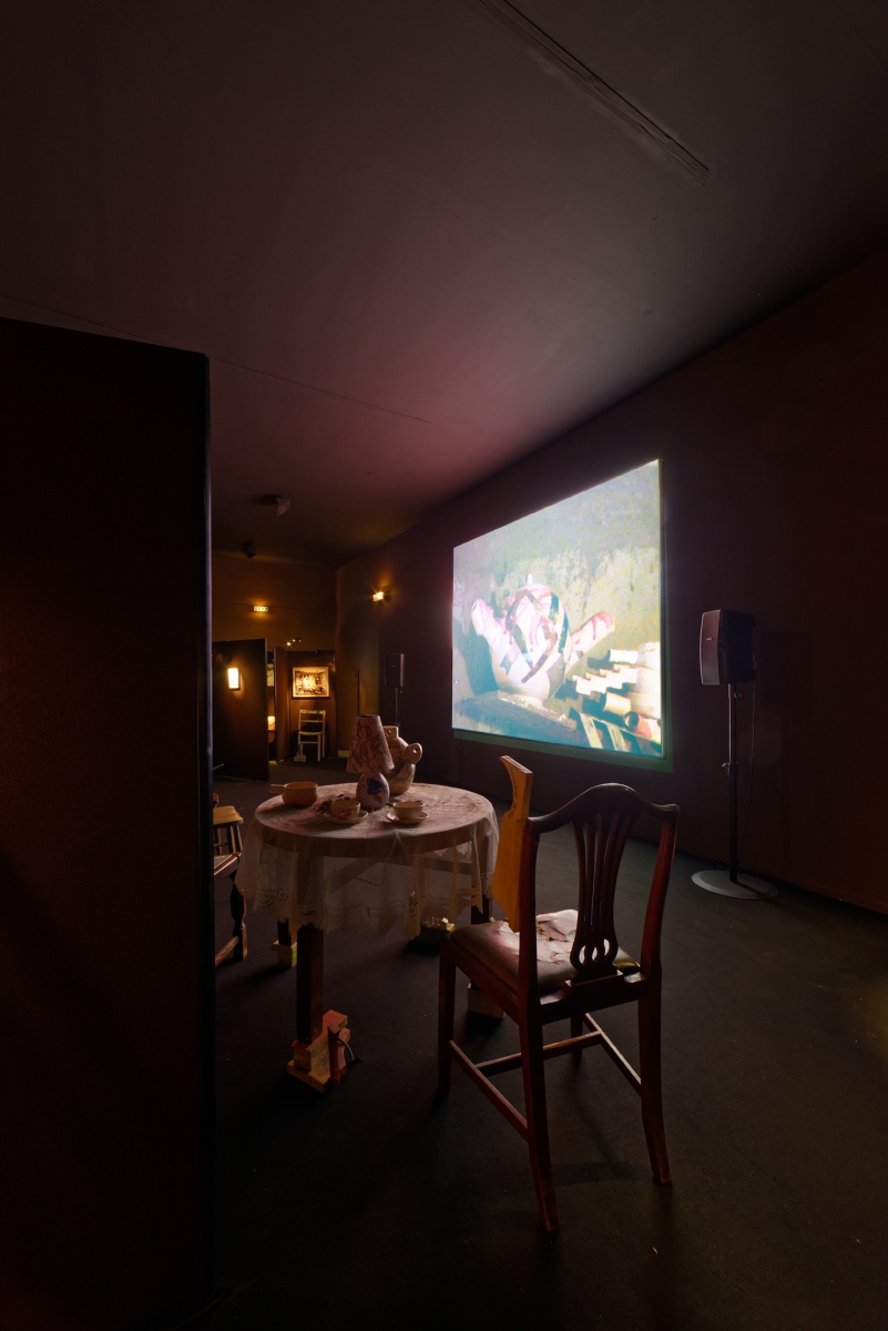 Le parcours d’exposition débute avec la pièce la plus ancienne, Wantee datant de 2013. On pénètre dans un espace confiné, saturé d’objets, de mobiliers, de vaisselles, de modestes peintures… Plongés dans la pénombre, les différents éléments présents dans la salle sont éclairés indépendamment les uns des autres ce qui confère à l’environnement une sensation de théâtralité. Autour d’une grande table en bois, une petite dizaine de chaises rafistolées sont mises à notre disposition. Durant 14 min, Laure Prouvost, en mode caméra embarquée, nous fait faire le tour du salon de ses grands-parents et en profite pour nous conter l’histoire de ces derniers. Elle nous explique patiemment que son grand-père, ancien artiste conceptuel et proche de Kurt Schwitters, s’est lancé il y a maintenant 20 ans dans la construction d’un tunnel, partant directement du salon, censé lui permettre de rejoindre l’Afrique. S’ensuivent la disparition du grand-père depuis 3 mois, les recherches menées pour le retrouver, des anecdotes sur sa grand-mère et son utilisation des sculptures de son mari et de Schwitters comme éléments de bricolage (cale-porte, chaise, porte-savon...). La tension de la vidéo repose sur un enchainement d’images au rythme soutenu et parfaitement maitrisé auquel l’artiste associe un fond musical, une voix off et la présence de textes qui ponctuent la vidéo et dynamisent l’ensemble. A travers ce système de synesthésie, Laure Prouvost parvient à jouer avec un panel très large d’émotions (joie, peur, mélancolie...).