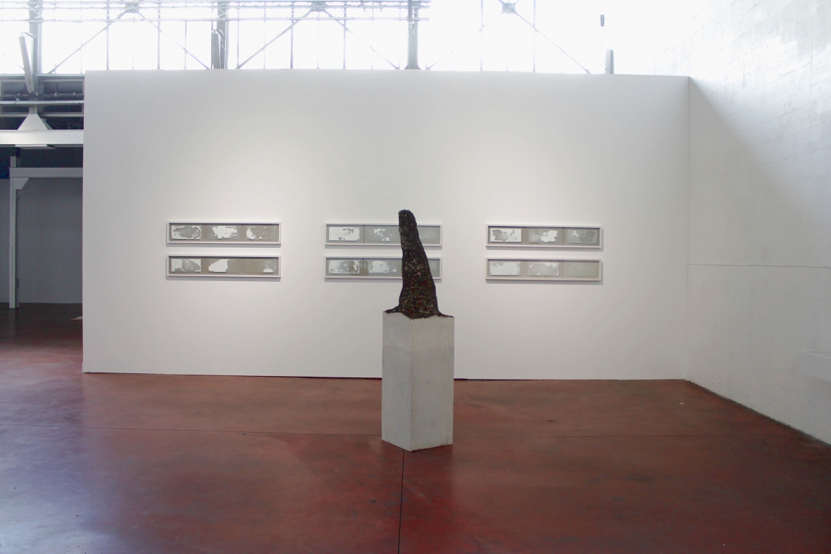 On ne peut faire l’expérience de la perte sans la penser en relation avec le temps. Il est une matière qui travaille et fait naître des formes : qu’il les informe – Creux (empreinte-durée) (2015) ou Marqueur (2015-2015) d’Arnaud Vasseux (France, 1969) – ou les menace – Sans titre (Cassable) 2015, Clermont-Ferrand (2015) du même artiste, opère la jointure de deux cimaises avec du plâtre non armé. Des œuvres qui relèvent, avec celles de Laurence de Leersnyder (France, 1979), de pratiques de moulage ou d’empreinte dont on sait – Georges Didi-Huberman, toujours – qu’elles matérialisent aussi bien une présence qu’une absence.