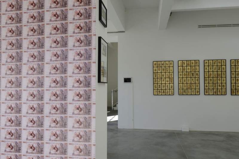 À la dispersion du fluide infecté, Journiac réagit par l’utilisation démultipliée de son propre sang. Les Billets de sang (1993) sont adressés à ses amis par voie postale avant d’être reproduits sous forme de planches (1995) recouvrant ici le mur d’entrée du rez-de-chaussée. Matérialisation de l’argent sale, c’est la reproduction mécanique des billets souillés qui est ici mise en avant. Lors de la Messe pour un Corps (Galerie Templon, 1969 ; Galerie Stadler, 1975), l’artiste communiait déjà avec le public sous la forme d’hosties de boudin réalisées avec son propre sang, rite communautaire parodique. Ses actions cherchent à atteindre chacun directement, sans intermédiaire. Les valeurs de partage et de fraternité, héritées de mai 68, s’opposent à l’individualisme dans lequel la consommation et la désinformation nous ont plongés.