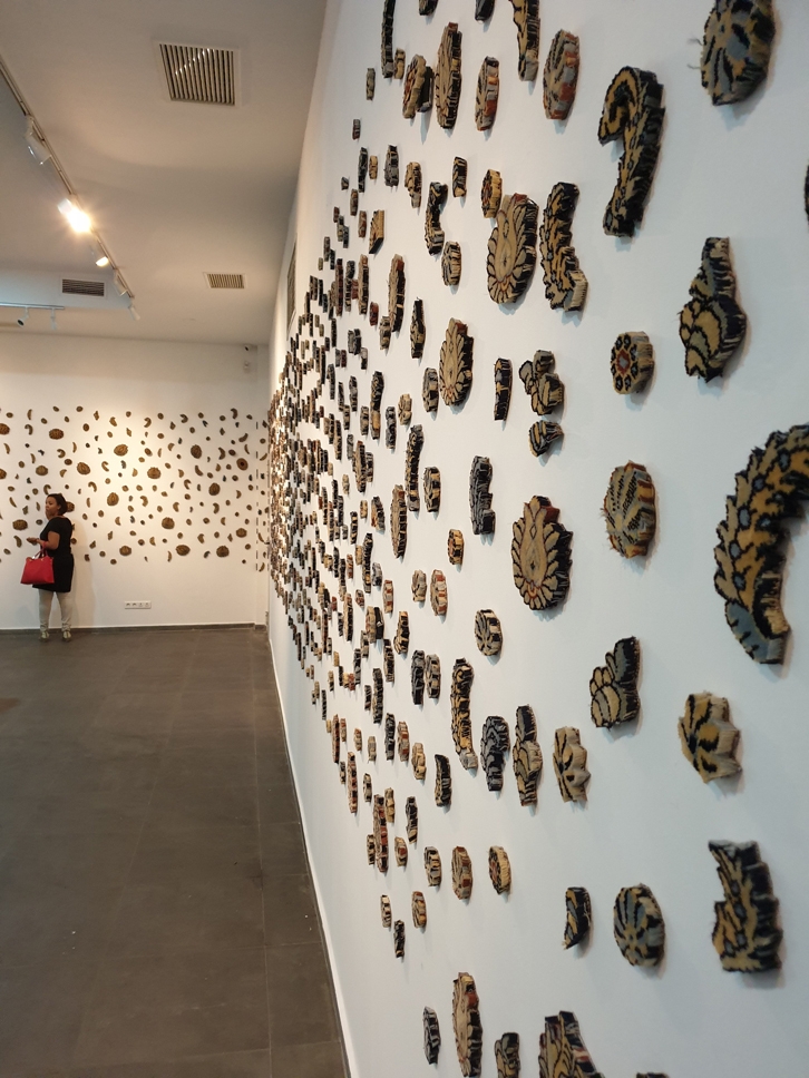 À l’initiative de l’artiste et financée par le réseau professionnel de Sadek Rahim, « Gravity³ » remplissait l’entièreté des espaces du MAMO11. Bien que de nombreuses œuvres présentées évoquent les notions de départ, d’inertie et d’immigration, Constellation (2019) et The Missing (2019) exemplifiaient les deux côtés du voyage clandestin à travers la Méditerranée. Les deux œuvres formaient une seule installation. Raham avait découpé individuellement chaque rose d’un tapis commercial sur lequel elles figuraient comme motif récurrent. Les roses étaient ôtées de telle manière à ce que le tapis ne perde rien de son intégrité structurelle, bien qu’il n’isole plus du froid et ne constitue plus une assise confortable et décorative. De l’autre côté de la galerie, Rahim avait installé les roses qu’il avait découpées comme autant d’étoiles dans le ciel nocturne. Libérées de leur existence quotidienne en tant que point d’ancrage du salon de tout un·e chacun·e, elles se dispersaient ou se regroupaient à leur guise, sans injonction.
