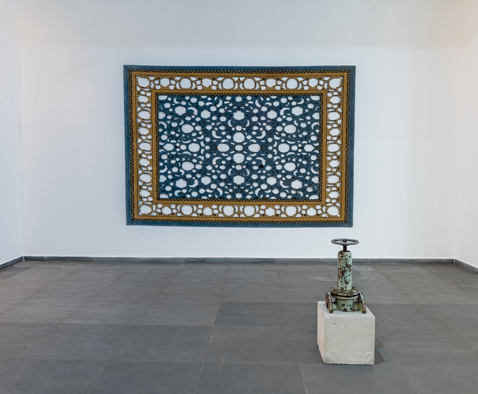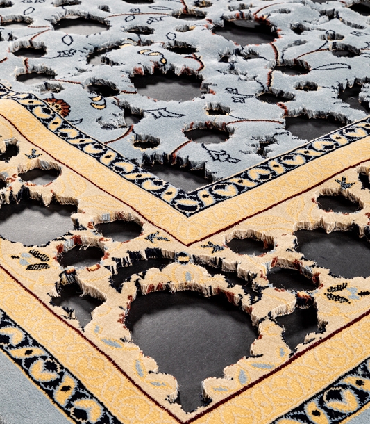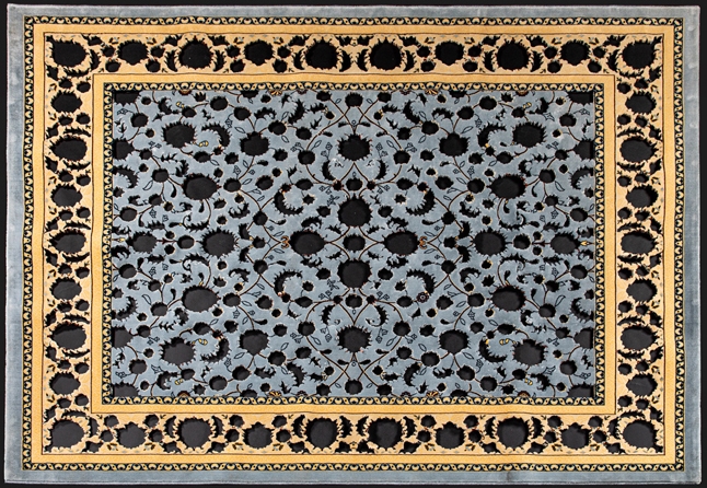 Le tapis oriental occupe une place centrale dans l’œuvre de Sadek Rahim. Il s’agit souvent d’un tapis produit de manière commerciale à destination d’une clientèle de masse et à l’aide de matériaux synthétiques. Il puise sa matière de cet objet banal, toutefois traversé de larges concepts idéologiques. « À l’occasion de discussions, j’ai souvent été invité chez eux par les jeunes que j’observais pour mon travail », explique Rahim à Marie Deparis-Yahil, curatrice de son importante exposition rétrospective « Gravity³ » (2019) au Musée d’Art Moderne d’Oran (MAMO). « Dans les villages, généralement, le moyen de s’asseoir et de recevoir les invités au salon consiste souvent en un grand tapis, des grands coussins et une table basse. Le plus souvent, le tapis est simple, acheté au marché du coin. Je ne pouvais m’empêcher à chaque fois de penser au mythe du tapis volant, lorsque ces jeunes commençaient à parler du projet de leur vie, de ce qui semblait être leur rêve ultime – une utopie : vivre dans un monde qu’ils ne connaissent que par la télé, l’Europe10. » Cette idéalisation de la vie en Europe (l’irréalité de la télévision) rappelle une idéalisation orientaliste (le mythe du tapis volant).
