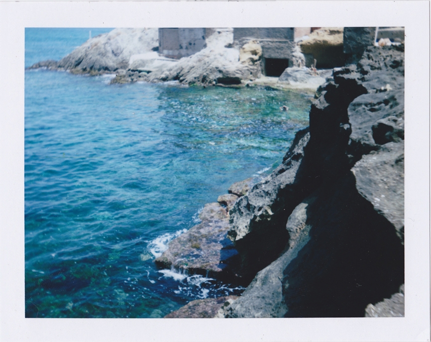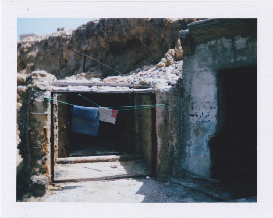 Fleeing Will Save Us (2016) de Lydia Ourahmane est un diptyque de deux petites photographies prises au Polaroïd. Faisant référence aux premières recherches menées pour un corpus d’œuvres plus large dont Fleeing Will Save Us fait partie, Ourahmane écrit : « Durant cette période, et même maintenant, pour les personnes avec lesquelles je travaille, l’immigration illégale est un sujet récurrent. Tout le monde se tient prêt·e à partir, tout le monde. Si vous demandez à quelqu’un·e de mon quartier combien cette personne connaît de gens ayant émigré, la réponse sera trente, quarante, peut-être cinquante de ses ami·e·s. Dans mon quartier, c’est un fait réel et permanent qui se produit tous les jours12. » Ourahmane s’est liée d’amitié avec certain·e·s de ces jeunes oranais·e·s de son quartier. Iels l’ont emmenée dans des grottes dans lesquelles iels sont resté·e·s un certain temps, avant de tenter de braver l’eau pour rejoindre l’Espagne. Les polaroids fonctionnent alors comme un mémorial de leurs rêves de traversée, précédant leurs tentatives, leurs arrestations et détentions subséquentes en Europe13. Sur un mur de béton situé au premier plan de l’un des polaroids, une phrase en arabe est gribouillée à la bombe. D’après l’artiste, on peut y lire : « Fuir nous sauvera14. »