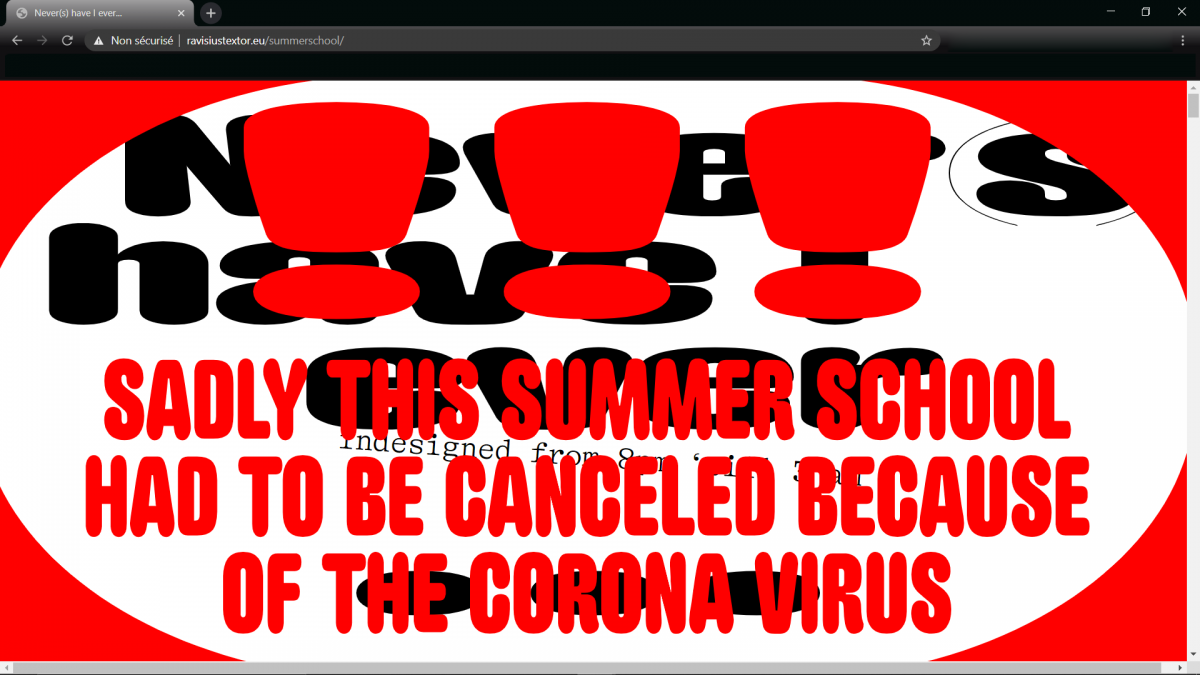Les récentes restrictions sanitaires n’ont pas découragé RT d’organiser des expositions, à l’image de la version en ligne de celle consacrée à Jean Tixier de Ravisi, sur la forme de la compilation (présentant des ouvrages renaissants et contemporains en une série de vidéos réalisées avec des étudiant·e·s du DnMade Graphisme). La summer school Never(s) Have I Ever a également été adaptée en l’exposition « Pas le choix », exposition d’affiches de Valentijn Goethals & Thomas Lootens, Corbin Mahieu, Ine Meganck & Chloé D’Hauwe, jeunes graphistes issu·e·s de l’école Sint-Lucas de Gant, dont la visibilité n’était garantie que pour une personne à la fois.