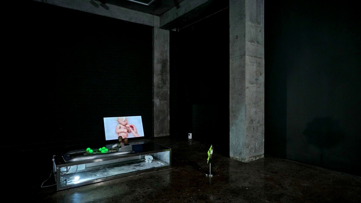 B.P. On a cherché cette balance dans la mise en exposition : on avait même mis de la lotion pour bébé sur les murs dans la cave. On voulait que le fait d’être plongé·e dans le noir procure de l’inquiétude mais aussi ce sentiment de solitude devant ces machines qui prennent soin de bébés humain·es et d’humain·es qui prennent soin de poupées, objets inanimés, que l’on découvre dans la vidéo.