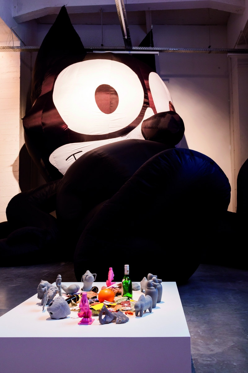 La multiplication des supports de Félix agit dans l’œuvre de Leckey comme les marques qu’utilise l’artiste, explicitant sa logique : la réalité des objets tient autant à leur matière qu’à ce que nous projetons sur eux. «You’re looking at stuff and then you’re producing them at the same time»3 Ainsi, la queue du chat de Flix procède par métonymie, amenant avec elle tout le signifié Félix, mais découpe l’écran, nous assurant de sa physicalité. Véritable veau d’or, surface de projection, Félix accueille des offrandes qui sont autant de petites miniatures des autres œuvres-signes de l’exposition. Le procédé fonctionne avec l’évocation de figures artistiques de référence. Ainsi, d’Henry Moore et de Richard Hamilton. Le premier voit son nom réifié dans un ensemble de posters formant une trilogie évocatrice : Samsung, Fiorucci, Henry Moore. Le second apparaît par l’intermédiaire de la présence de son ordinateur dans l’installation UniAddDumThs. La figure d’Hamilton convoque non seulement le premier artiste ayant étudié la mécanisation et la numérisation des images, mais surtout une méthodologie. Se réclamant des théories de l’information et de la communication de son époque qu’il transpose dans le domaine de figuration, Hamilton aborde en effet le collage comme «image et message» et les images comme des bits4.